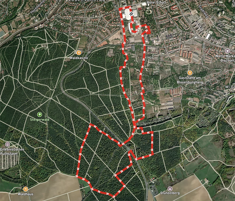 Die Strecke bietet einige bemerkenswerte Merkmale: Zu Beginn geht es etwa 700 m berg an bis zur Thüringenhalle. Hier heißt es, Kräfte gut einteilen und nicht zu überpacen. Danach verläuft die Strecke etwas flacher, bevor es bergab durch den Luisenpark geht, der mit seinem technischen Anspruch punkten kann. Auf den letzten 600m führt der Streckenverlauf dann in und durch das Steigerwaldstadion. Aus dem Stadion heraus sind es noch 150 m bis zum Ziel.